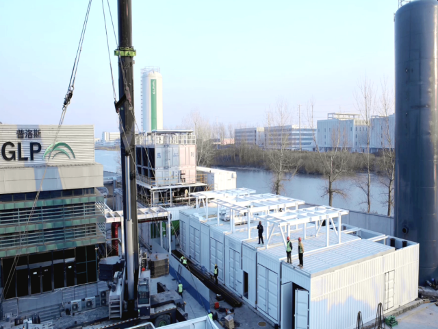三期項目將單機冷量從1300RT提升至2200RT,創下了目前國內外最大規模的預制集成冷站紀錄。預制化集成冷站在工廠進行預裝和調試,解體后運至現場進行拼裝組合,在20小時內集裝箱吊裝拼接就位,冷卻塔僅需簡單吊裝就位以及管路連接。就位后半個月即可完成內部管道、橋架、電纜等施工連接,具備通水通電條件,節省了大量現場施工時間,較一二期的室內預制化解決方案相比,吊裝時間優化至16小時,整體項目交付周期縮短30%以上。以預制化建設、智能運維與超低PUE的卓越實踐,為數據中心行業呈現了高效與節能并重的行業新范式。它不僅是一次技術集成的成功示范,更是對未來數據中心“快速交付、綠色運營”模式的有力回應。